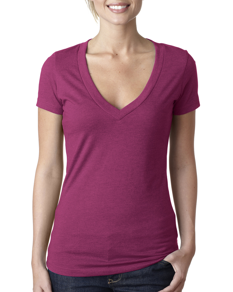 Slim-fitting and exceptionally soft, the Next Level 6640 ladies deep v-neck tee is made using 4.3 oz 60% combed ringspun cotton and 40% polyester for a slightly heathered look. Pre-laundered to reduce shrinkage, the Next Level 6640 features a 1x1 baby rib-knit set-in collar, is side seamed for added structure, and has a convenient tear away label. If you’re looking for women’s v-neck tees in a wide variety of colors and sizes, the Next Level 6640 is the one for you!